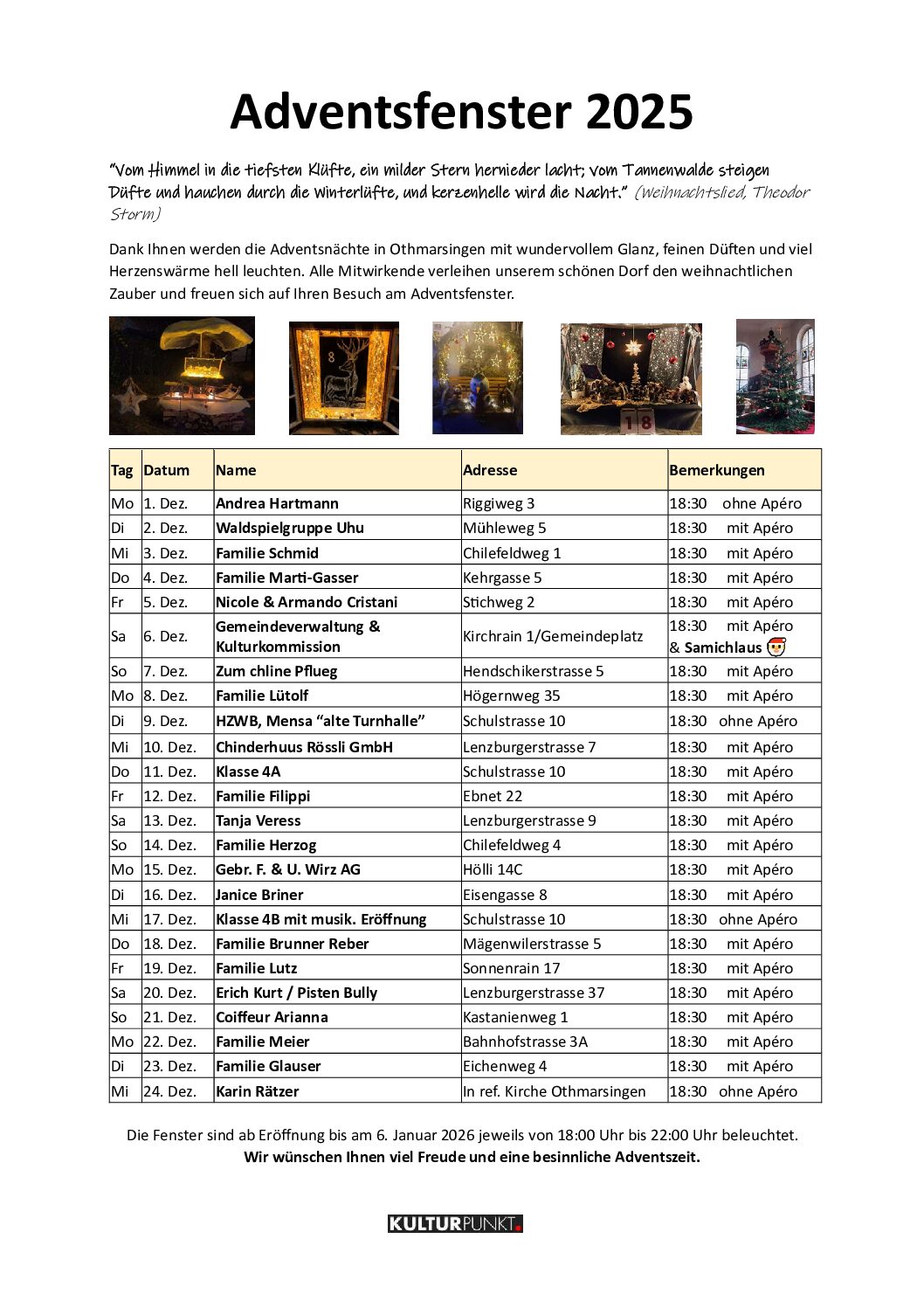 Auch dieses Jahr wird unser Dorf dank ihren stimmungsvollen «Adventsfenster» in Glanz und Wärme verzaubert. Es können Fenster, Gärten oder auch Eingangsbereiche weihnachtlich geschmückt werden. Unsere Vorfreude auf diese schöne Adventszeit ist jetzt bereits schon riesengross und steigt mit jeder Anmeldung 😉 Wir freuen uns sehr auf Sie.